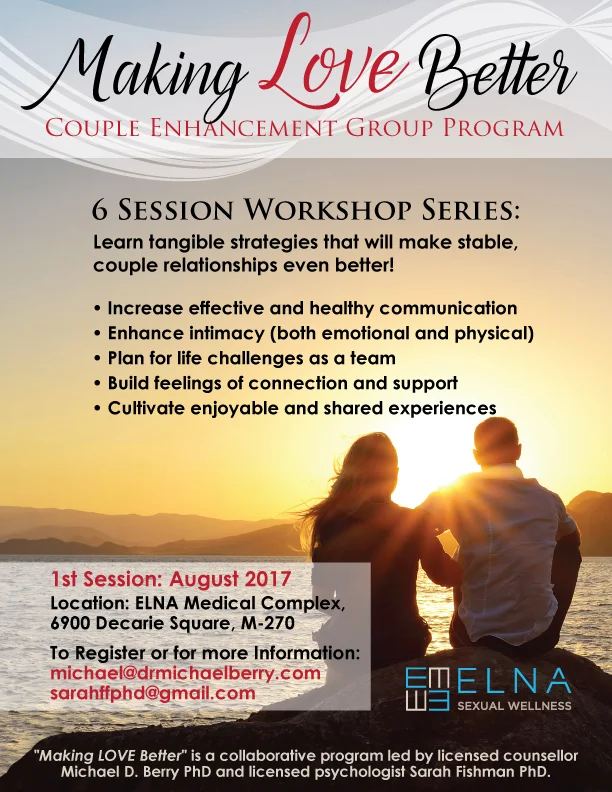 Pour vous inscrire ou pour en savoir plus sur le groupe d'amélioration du couple, veuillez envoyer un courriel à: sf@drsarahfishman.com ou michael@drmichael.com.